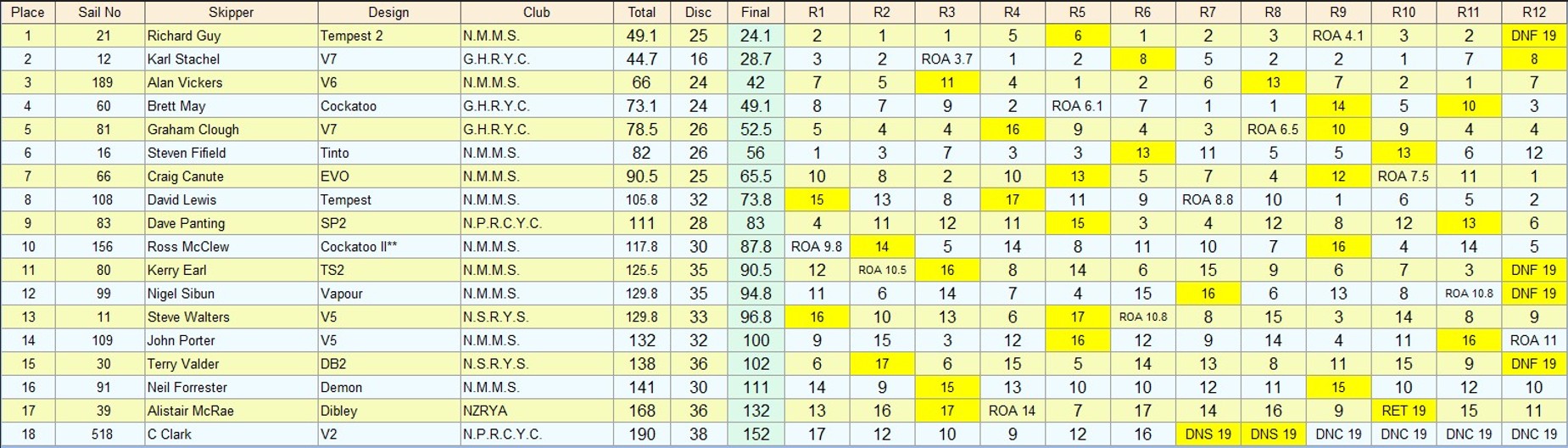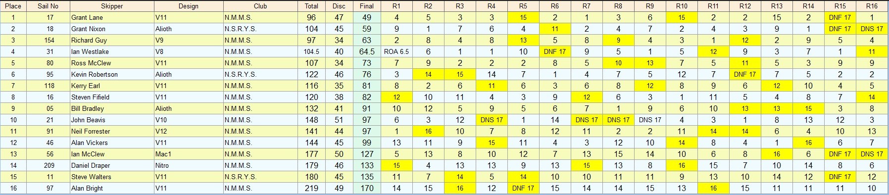 Ian Westlake (V8) is consistant enough to hold off Jenna Menzies (K2) by 3 and a bit pts, with Nigel Sibun (V11) another couple of points back. The victories were spread throughout the fleet - with Bill (Alioth), Alec (Venti) and Glenn (Venti) also scoring wins.