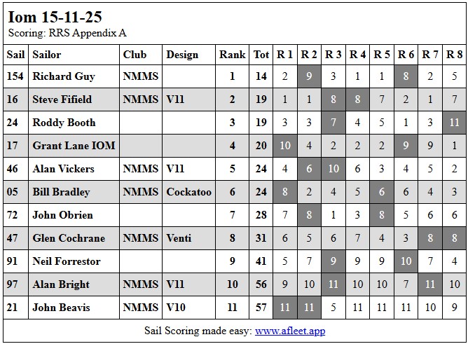 Cap'n Bill Bradley wins the day on countback from Steve Fifeld, both on 10 pts, with Danial Draper 3rd 5 pts behind. (Bill had a particularly good day when you also look at the IOM results!!)