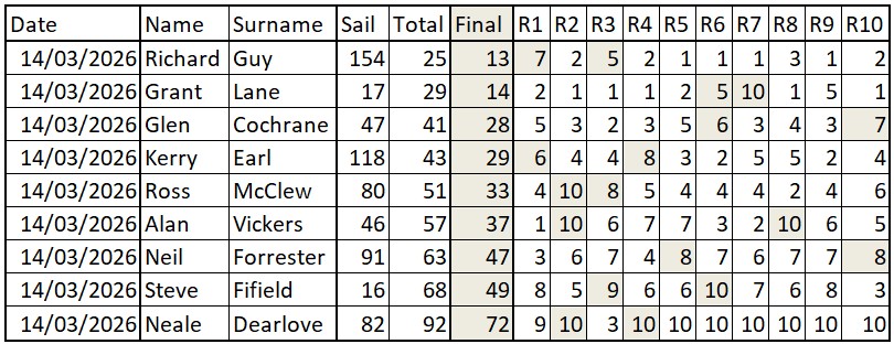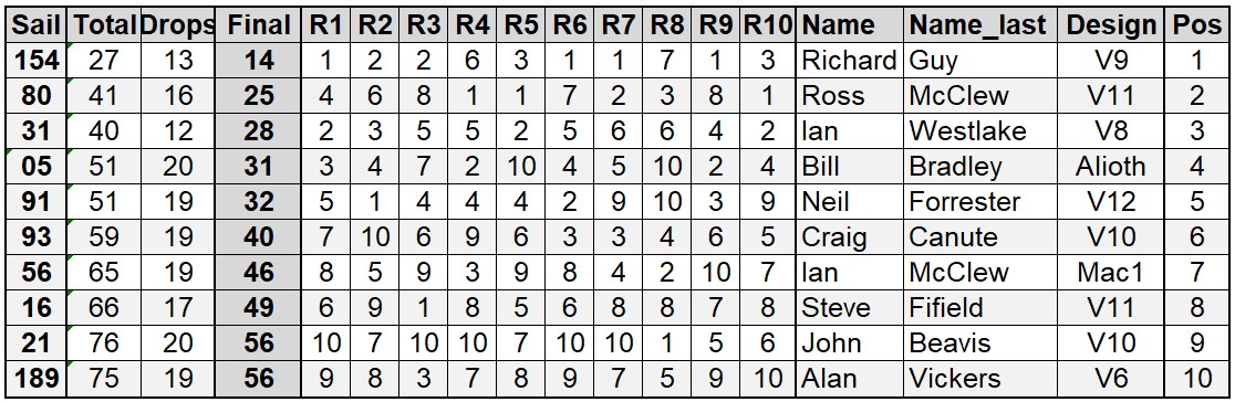 Richard Guy (V9) wins after 10 races, by one point from Ross McClew (V11) and Nigel Sibun(V12)- tied on points, with Ross getting 2nd on countback.